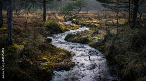 Sunset illuminating mossy riverbanks in a coniferous forest during early spring