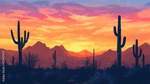cactus, sunset, desert, mountain, sky, landscape, silhouette, nature, horizon, cloud, gold, red, orange, purple, pink, art, illustration, graphic, design, background, digital, painting, scene, beauty, peaceful, serenity, tranquil, vibrant, colours, warm, light, sun, ray, twilight, dusk, arid, dry, flora, plant