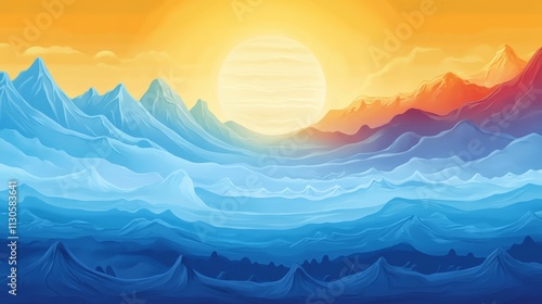 sunset, mountain, landscape, hill, blue, orange, yellow, sun, sky, cloud, vibrant, colourful, scenic, vista, view, horizon, serene, peaceful, tranquil, majestic, grand, huge, huge, range, peak, vale, digital, art, illustration, abstract