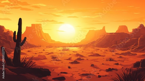sunset, desert, canyon, cactus, rock, sky, orange, red, sand, sun, cloud, horizon, hill, mountain, landscape, nature, environment, hot, arid, dry, vegetation, ground, foreground, background, silhouette, bright, warm, colours, hue, shades, light, shadow, huge, immensity, solitude, stillness