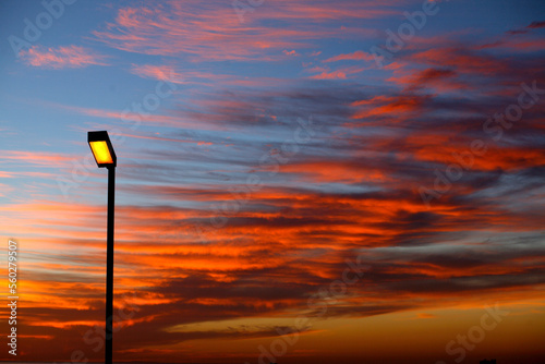 cloud, color image, dusk, electricity, empty space, environment, evening, hope, horizontal, industry, lamp, light, lit, negative space, nobody, no one, outdoors, pole, sky, street light, sunset