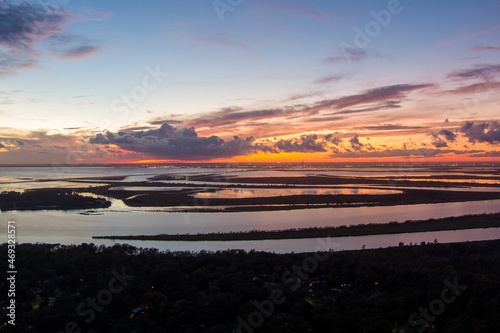 alabama, gulf coast, bay, waterfront, water, sunset, dusk, evening sky, sky, cloud, sun, twilight, wetland, skyline, horizon, coast, seascape, sea, beach, ocean, lake, daphne, highway, interstate, aerial view, background, landscape, scenic, tranquil, travel