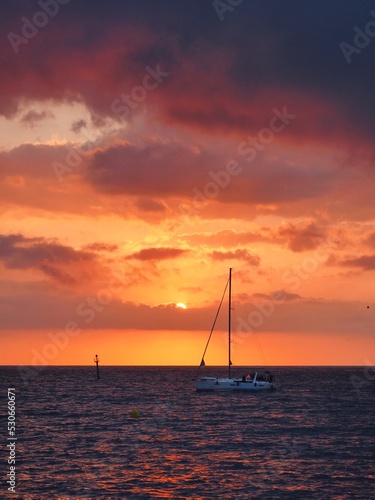 sunset, sea, boat, water, heaven, sun, ocean, sunrise, sailboat, sloop, ship, sail, silhouette, nautical, horizon, nature, orange, summer, travel, cloud, beach, dawn, evening, calm