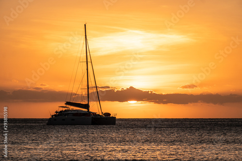 Sunset over two catamaran sailboat off the Yasawa island in Fiji