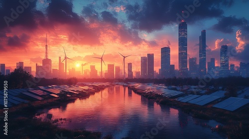 Sunset over urban wind turbines and solar panels modern city skyline environmental landscape serene water reflection eco-friendly concept