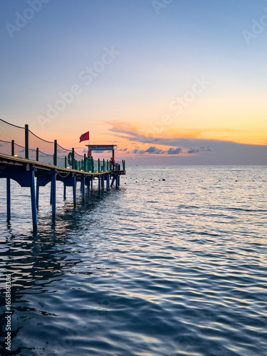 Sunset pier with lifeguard post over tranquil sea