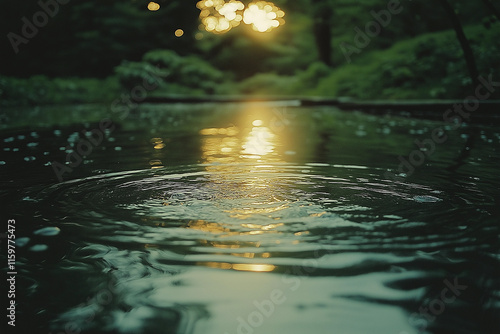 sunset, duck pond, water, ripple, calm, peaceful, nature, serene, tranquil, evening, golden hour, green, foliage, still water, sunlight, background, blurred, atmosphere, scene, peace, quiet, relaxing, zen, meditation, spa, summer, outdoors, landscape, photo, image, photo, water reflection, golden light, soft light, natural light, closeup, macro, detail, texture, surface, circle, wave, movement, stillness, contrast, colours