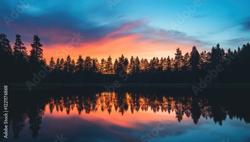 Sunset Serenity: Mirrored Forest and Lake