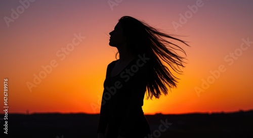 silhouette, person, sunset, wind, hair, freedom, colours, orange, purple, pink, sky, light, emotion, feeling, dramatic, contrast, horizontal, overhead, image, introspection, relaxation, sunrise, warm colors, copy space, profile, view, photo, color image, long hair, still life