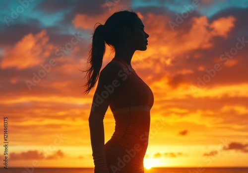 sunset silhouette of a female athlete in sportswear symbolizes inner peace and physical strength, ideal for promoting fitness and personal growth.