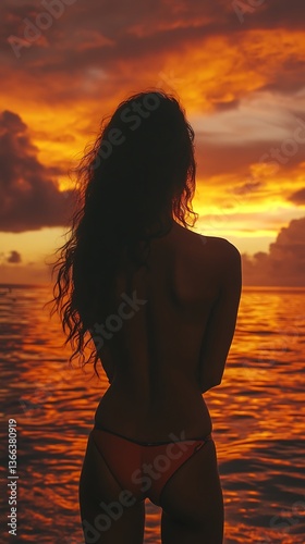 silhouette, woman, beach, sunset, ocean, tropical, travel, vacation, golden hour, orange, red, sky, cloud, back, figure, swimwear, bikini, tranquil, calm, peaceful, relaxation, freedom, summer, paradise, exotic, tour tourism, beautiful, model, outdoors, nature, hot, warm, gold, warm colors, sunrise, modern, corporate, creative