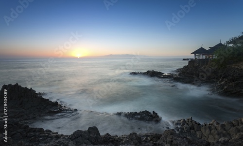 Sunset, surf on rocky coast, Costa Adeje, Tenerife, Canary Islands, Spain, Europe