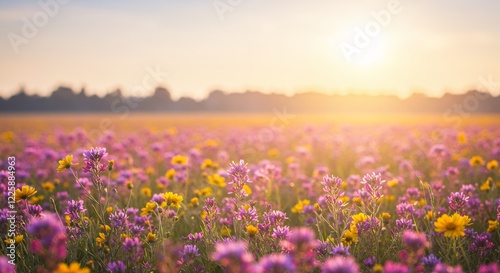 wildflower, sunset, meadow, landscape, photo, purple flower, yellow flower, golden hour, nature, spring, summer, field, floral, beautiful, serene, peaceful, calm, tranquil, wallpaper, home decor, digital artwork, hi-res, vibrant, colourful, bright, sun, sky, horizon, countryside, rural, natural, scenic, image, photo, picture