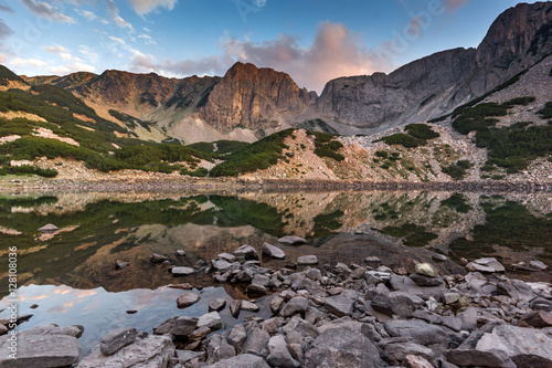 Sunset with Colored in red rock Around Sinanitsa peak and the lake, Pirin Mountain, Bulgaria