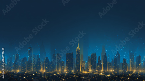 Sunshine in the Smart digital Innovation city with connection network reciprocity over the cityscape. of future smart wireless digital city and social media networking systems that connects