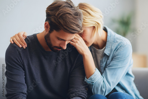 Supportive couple sitting quietly, one comforting the other. Emotional concept image of a supportive couple sitting closely, one offering silent comfort. Ideal for themes of empathy, grief, mental hea