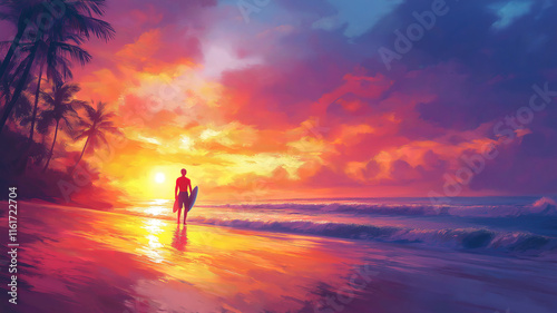 Surfers on a tropical beach at sunset with a panoramic view of the ocean and sky