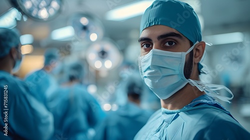 surgeon in operating room, a man wearing a surgical mask and scrubs in a room with other medical equipment in the background