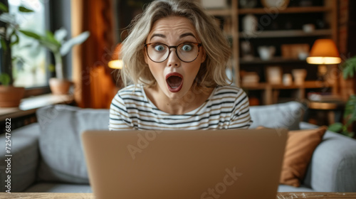 Surprised girl watches social media video using laptop