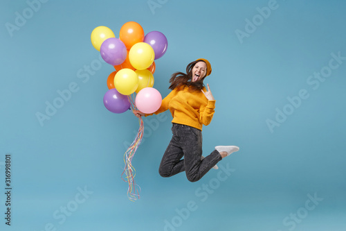 Surprised woman in sweater hat posing isolated on blue background. Birthday holiday party, people emotions concept. Mock up copy space. Celebrating hold air balloons jumping showing horns up gesture.