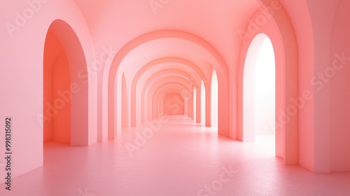 Surreal 3D render of an abstract arch corridor featuring a pastel pink background Artistic interior illustration with dreamlike elements