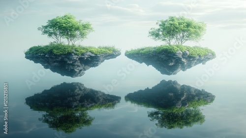 Surreal dreamlike landscape featuring floating levitating islands suspended above a tranquil reflective lake or pond The scene has a mystical ethereal atmosphere with lush greenery trees