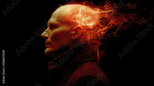 surreal image of man with bald head, smoke and flames emanating from his head, creating dramatic and intense atmosphere