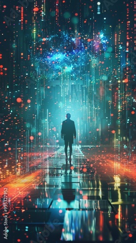 man, business, technology, concept, success, person, digital, creative, city, light, abstract, computer, businessman, blue, career, network, communication, walking, cyberspace, space, sky, achievement, modern, night, background, binary, adult, young, urban, suit, opportunity, connection, view, datum, way, future, male, cyber, tech, exposure, double, goal, science