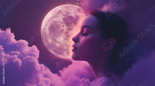 Surreal portrait of a woman blending with a glowing moon, floating in purple clouds, evoking a dreamlike atmosphere of tranquility and cosmic introspection. Cosmic Serenity. Illustration
