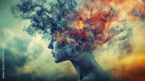 Surreal Portrait of Woman with Fiery and Smoky Abstract Elements, Dreamlike Expression, and Multicolored Atmosphere