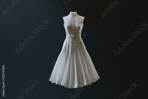 dress, white, minimalist, modern, sheath, suspended, air, pristine, elegant, buttons, back, exposed, clean, line, architectural, lighting, professional, studio, fashion, apparel, garment, style, chic, sophisticated, design, simplicity, form, texture, fabric, contemporary, formal, neutral, grey, background, vertical, presentation, glamour, graceful, refined, sculptural, volume, tailored, structured, subdued, shadow