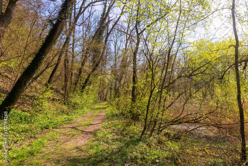 Swampy alluvial forest at the confluence of the Lech and the Danube near Marxheim in Bavaria on a sunny spring day