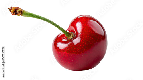 Sweet Cherry: A close-up shot of a single, luscious cherry, glistening with a vibrant red hue. The stem extends gracefully, inviting a moment of pure, fruity delight.