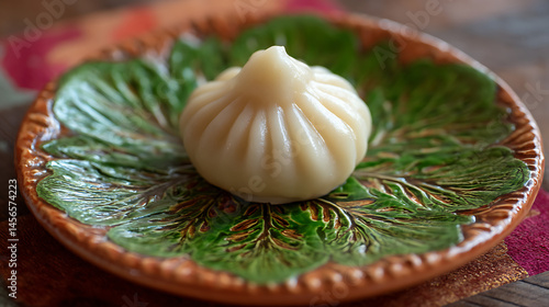Sweet Modak on Leaf Plate: A single, delicately pleated modak rests on a charming leaf-patterned plate, capturing the essence of traditional Indian sweets.