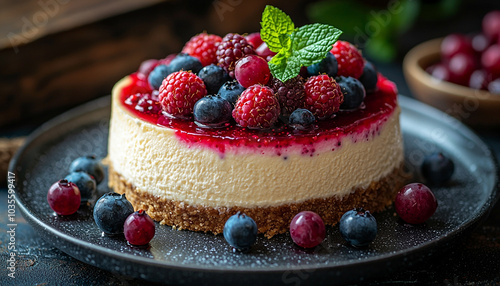 Sweet raspberry cheesecake on rustic wooden table plate generated by AI