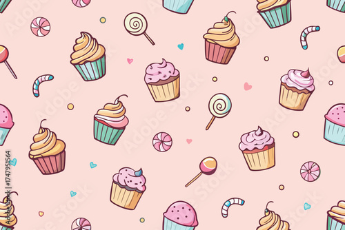 cupcake, lollipop, sweet, dessert, pattern, seamless, background, pink, hand, drawn, illustration, food, confectionery, treat, cake, sugar, sweet, bakery, childhood, playful, cute, whimsical, drawing, vignetting, art, design, texture, repeat, motif
