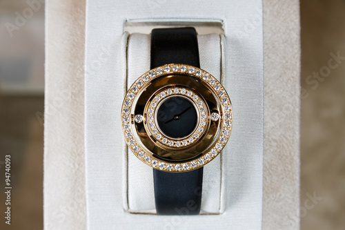 Swiss luxury watch with diamonds on the table. Woman fashion accessories.