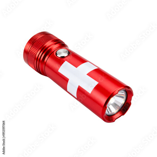 Switzerland Flag Flashlight, Swiss Cross Outdoor Gear Design, Red and White Colors, Isolated on White Background