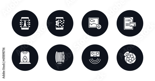 symbol for mobile filled icons set. filled icons such as digital strategy, digital transformation, add photos, credit report, business incubator, filament, active sensor, disk brake vector.