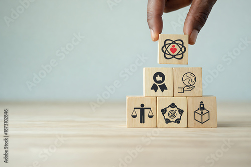 Symbolic Foundation: A hand carefully places a block atop a stack of wooden blocks adorned with meaningful icons, forming a visual representation of strong foundations.
