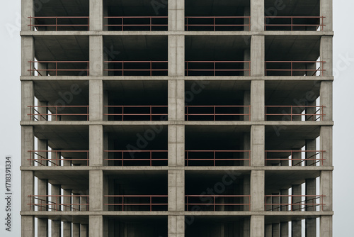 Symmetrical close-up of unfinished skyscraper with exposed concrete and safety rails