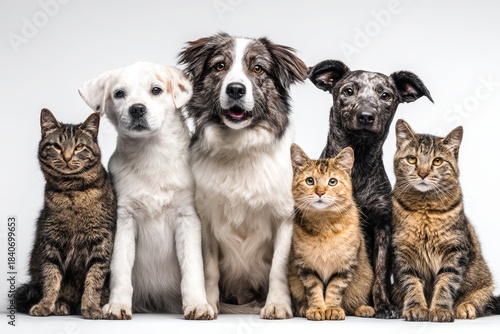 Symmetrical Group Portrait of Cats and Dogs on White Background