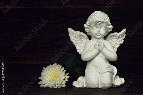 sympathy, card, guardian angel, flower, funeral, condolence, all saints' day, memorial, angel, chrysanthemum, cherub, white, children, baby, loss, death, praying, kneeling, tree branch, blooming, blossom, figurine, little, young, burial, love, remembrance, religious, wooden, background, dark, sorrowful, grief, grieved, sculpture, sitting, decoration, flower petals