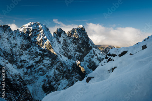 mountain, snow, winter, landscape, heaven, travel, cloud, peak, rock, boulder, stone, frost, coolness, trekking, blue, whiteness, pass, approach, massif