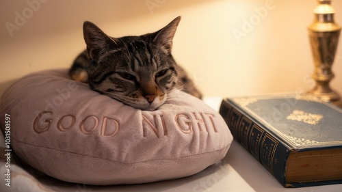 Tabby cat resting on "Good Night" pillow with book in cozy room