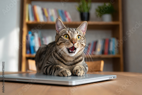 cat, tabby, animal, pet, felino, domestic, mammal, creature, cute, adorable, playful, curious, curiosity, surprised, shocked, amazed, astonished, excited, mouth, open, yawning, talking, laptop, computer, keyboard, desk, table, wood, furniture, bookshelf, book, plant, home, indoor, lifestyle, work