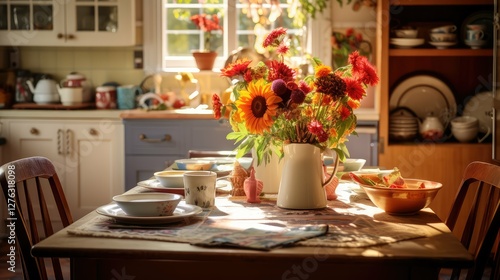table, kitchen, dining, illustration, chair, plate, goggles, flower, cosy, rustic, wooden, atmosphere, meal, family, decor, setting, home, interior, design, style, comfort, inviting, space, ambience, tableware, centrepiece, arrangement, casual attire, welcoming, environment