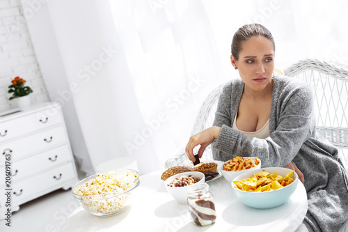 Table with snacks. Somber beautiful woman posing at table and looking aside