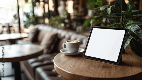 cafes, tablet, screen, hot drink, technology, table, modern, furniture, display, device, object, indoor, cup, background, leisure, seating, digital, environment, sharpened, wood, cosy, relaxed, arrangement, plant, blurred, communication, around, peaceful, composition, warm, lifestyle, quiet, brown, horizontal, blank, room, simple, beverage, depth, angled, natural, perspective, nobody, interior, drink, still, life, casual attire