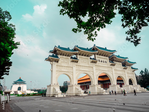 Taipei, Taiwan - May 13, 2019: Arch in front of the Liberty Square (Freedom Square) Main Entrance gate with tourist visiting Chiang Kai-Shek memorial hall in Taipei Taiwan.